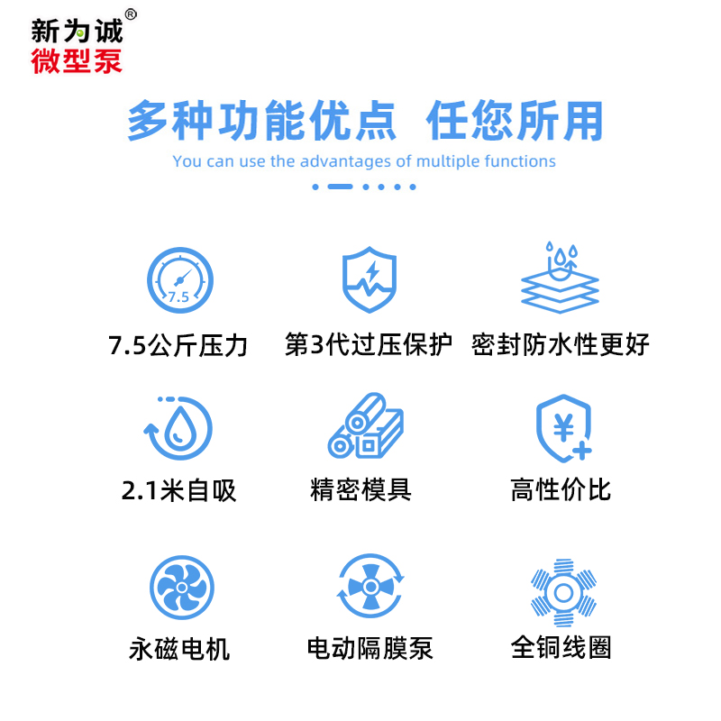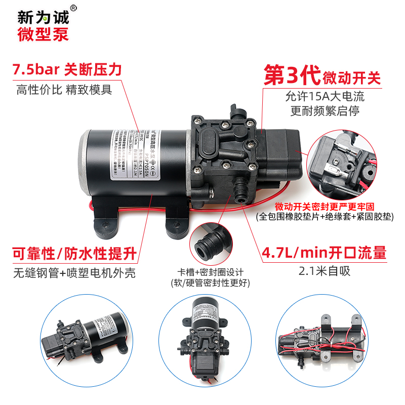 微型自吸压力水泵PSP-N系列,自吸极快(1-3S)且稳定,吸程2.1米!MAX压力可到7.5bar,开口流量4.7升/分钟,属微型水泵中兼具压力、自吸、流量较高产品,性价比高!